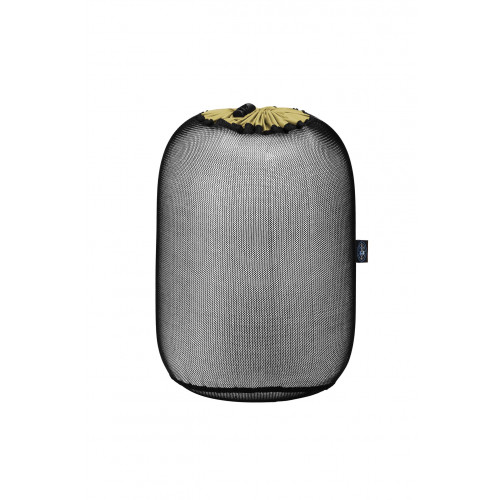 Cylinderformet pakpose i sort netmateriale med snørrelukning